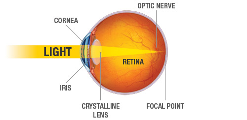 Cornea, first layer of the eye and bends the light, after goes by the Aqueous Humor; the Pupil ,opening in the Iris where the light goes into the eye; the Lens,that change shape to focus light on the retina; the Vitreous Humor, this extra component helps to give shape to the eye; the Retina,where are found the photoreceptors for vision and the Optic Nerve finally send this information to the brain where is transform to images.